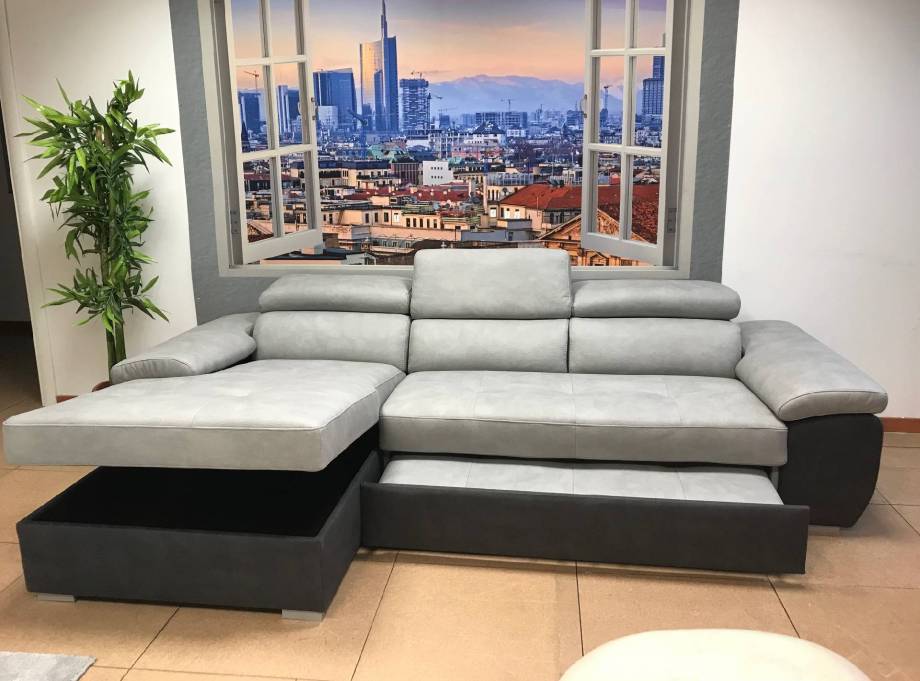 Divano angolare con letto estraibile, pouf contenitore destro o sinistro e poggiatesta reclinabili