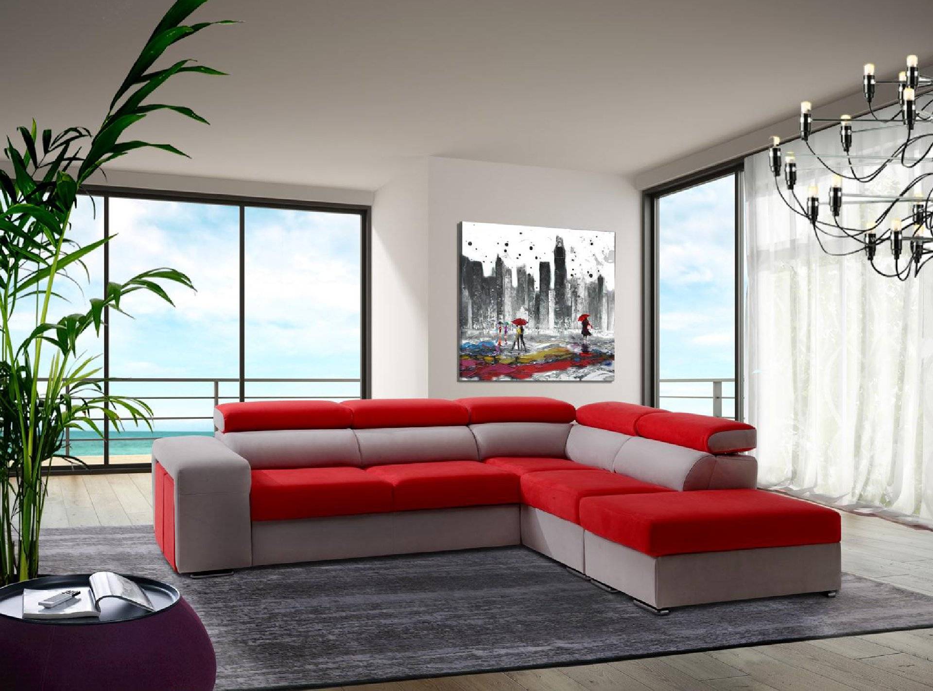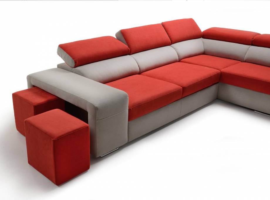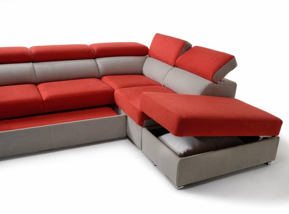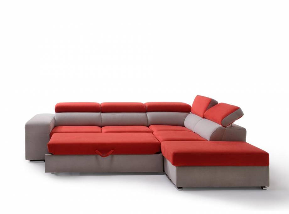 Divano angolare 3 posti con letto estraibile e pouf contenitore destro o sinistro, poggitaesta reclinabili e 2 posti pouf