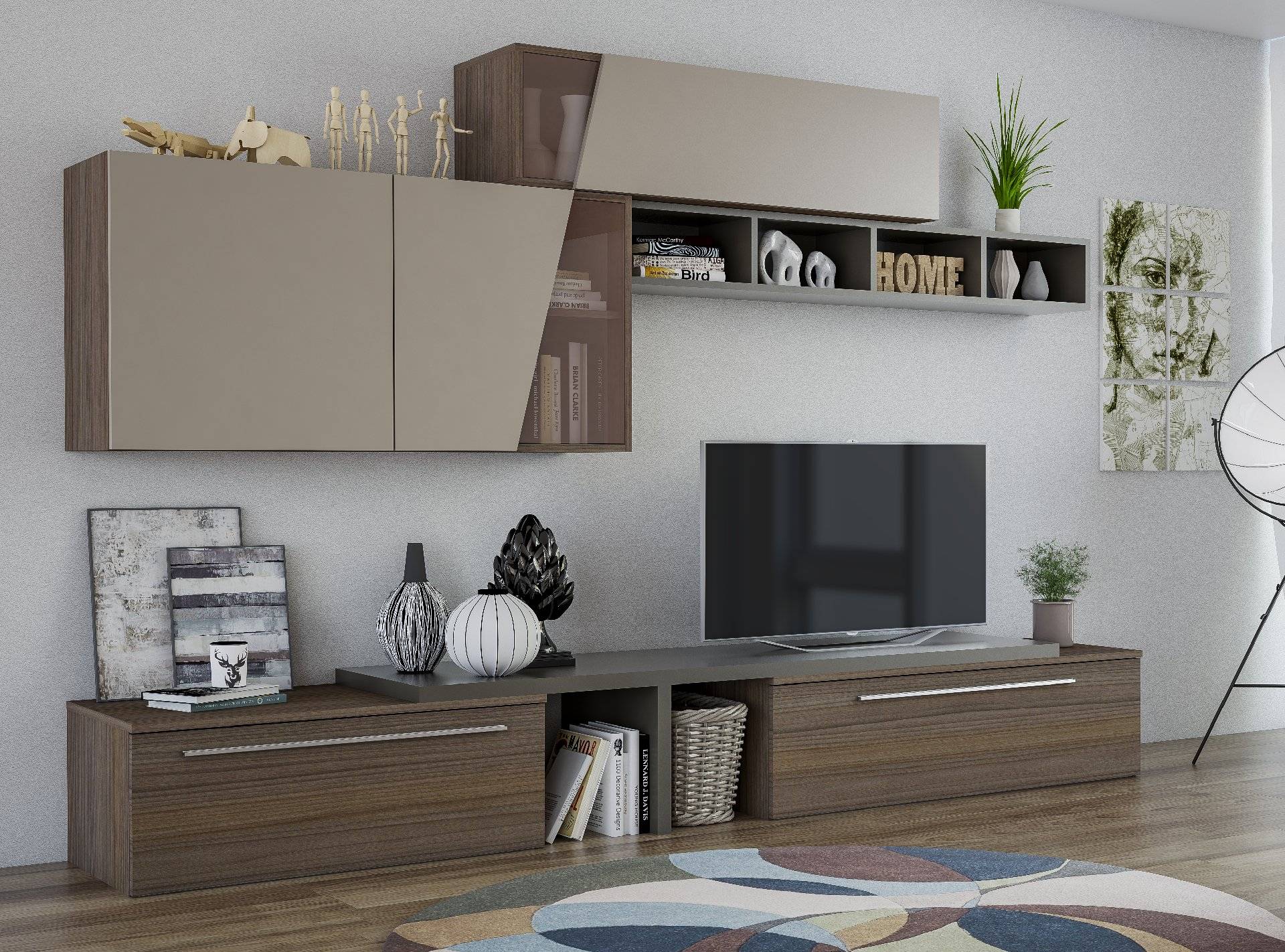 Parete soggiorno componibile con vani a giorno e pensili con anta diagonale e vetrina