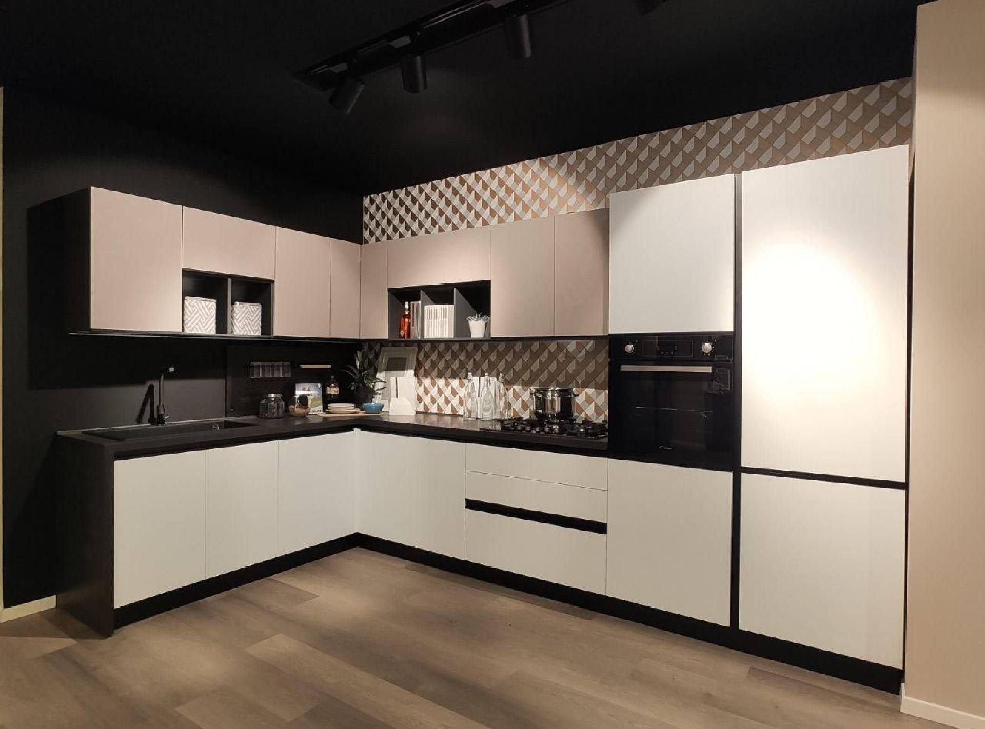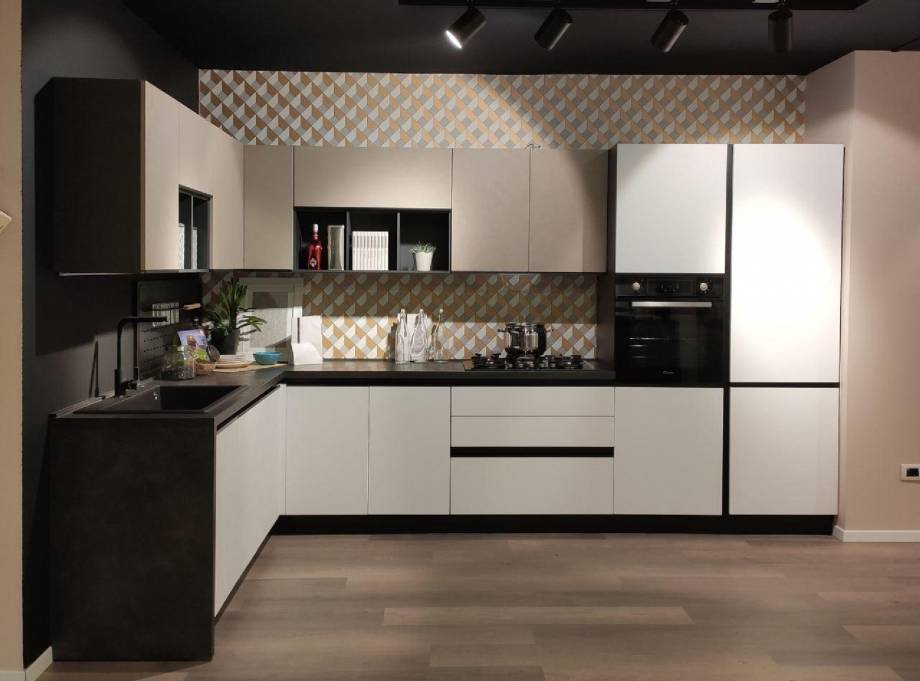 Cucina angolare componibile completa di 5 elettrodomestici (frigorifero, forno, piano cottura, lavastoviglie e microonde)