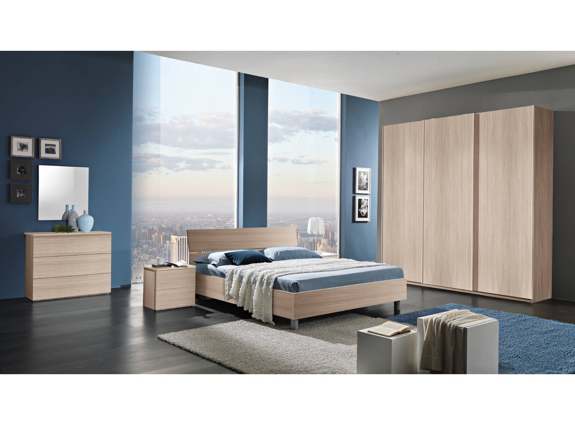 Camera completa di letto, armadio scorrevole, comodini, comò e specchiera