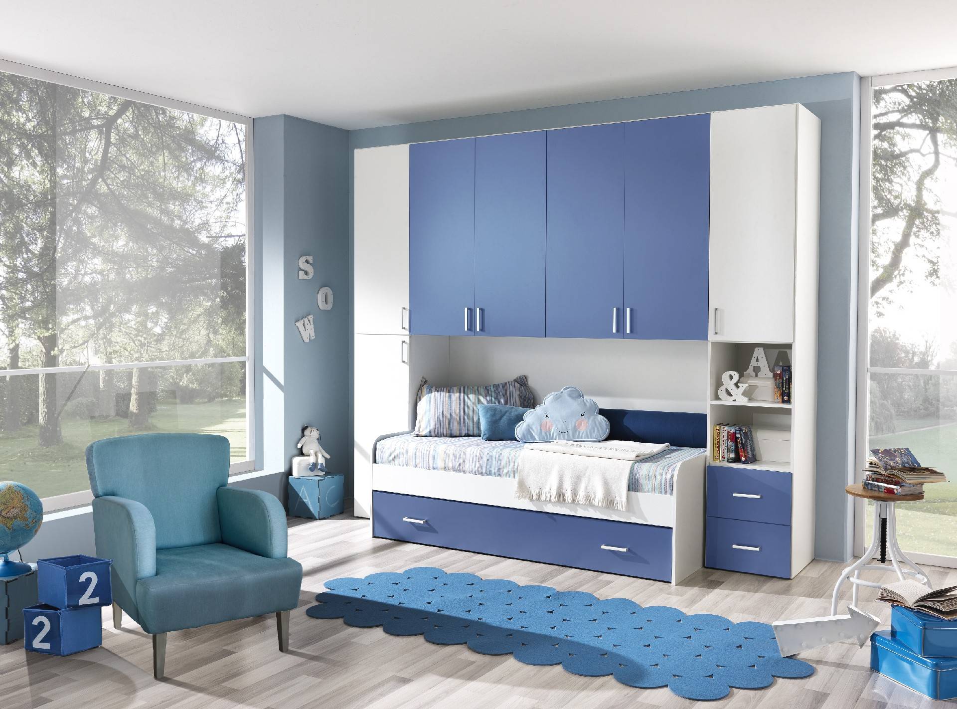 Cameretta a ponte con doppio letto estraibile e vani a giorno