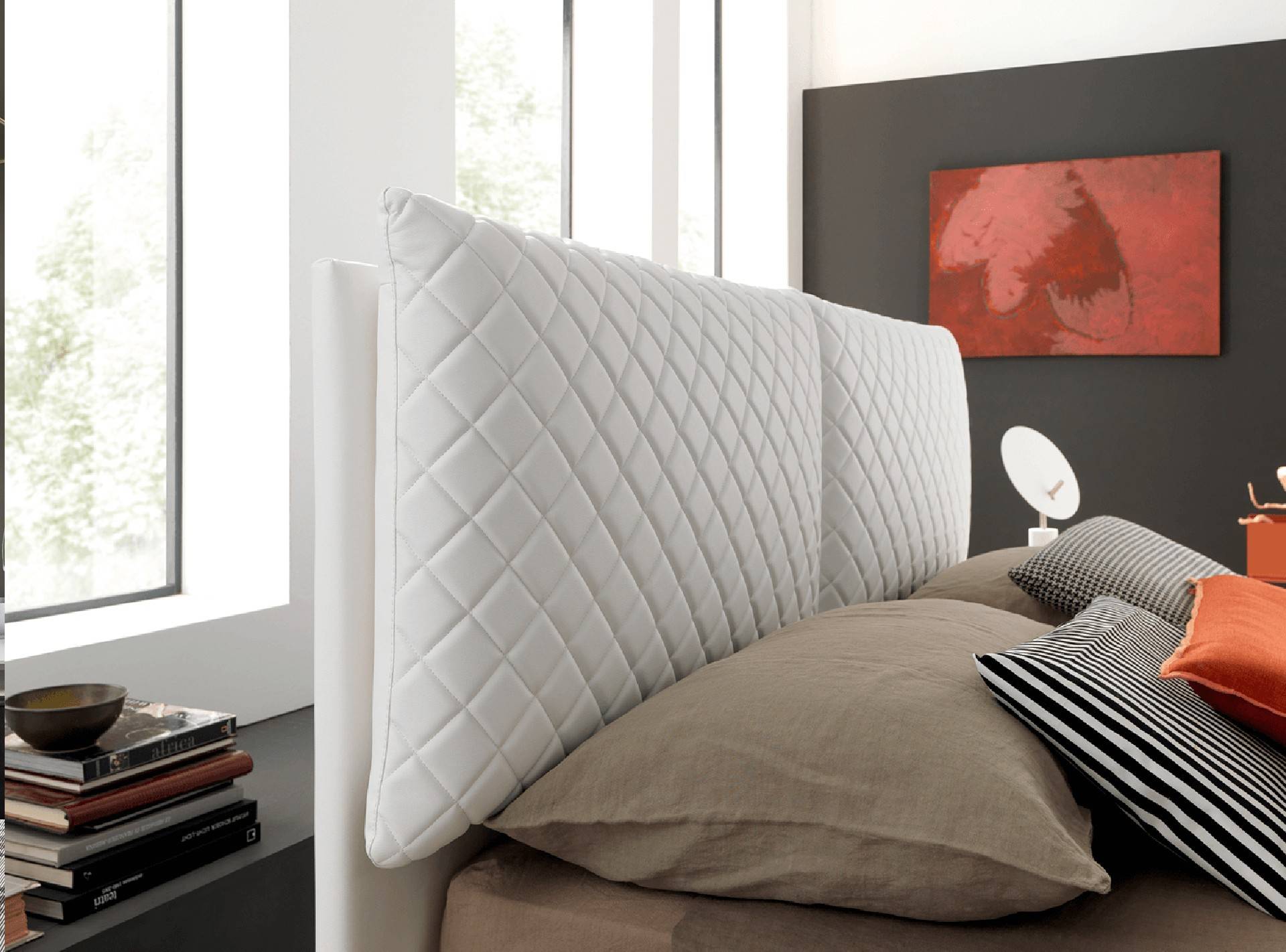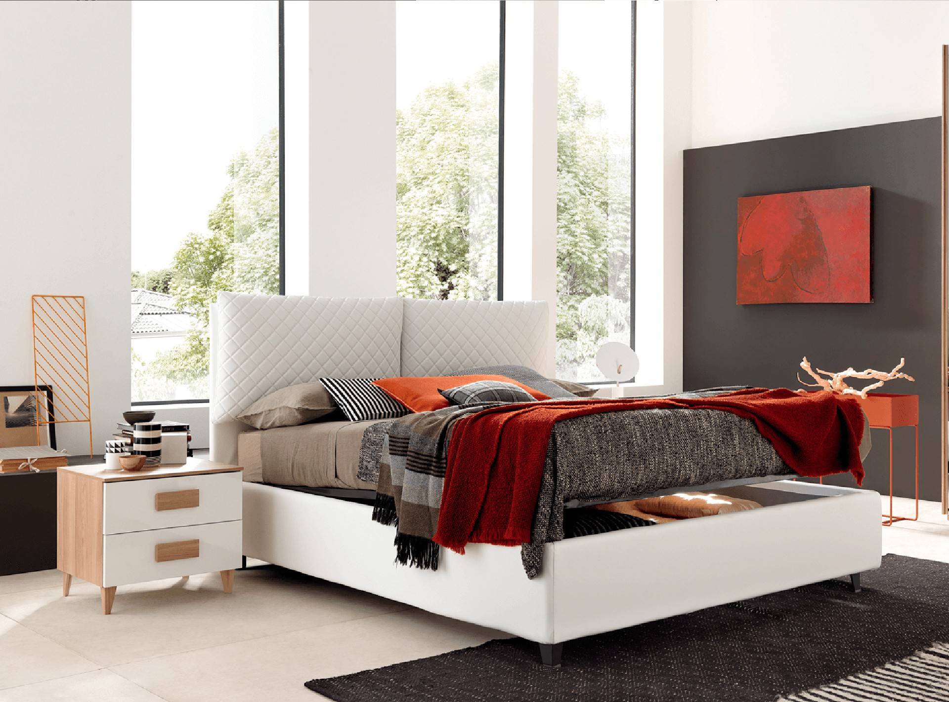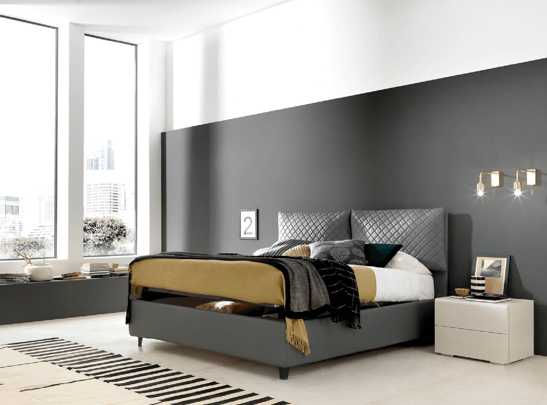 Letto matrimoniale contenitore con testiera completa di cuscini con trapuntatura a rombi. Modello in soffice eco-pelle che esalta le minime sfaccettature, valorizza ogni particolare e le linee sobrie. Struttura e cuscini in tessuto completamente sfoderabile.