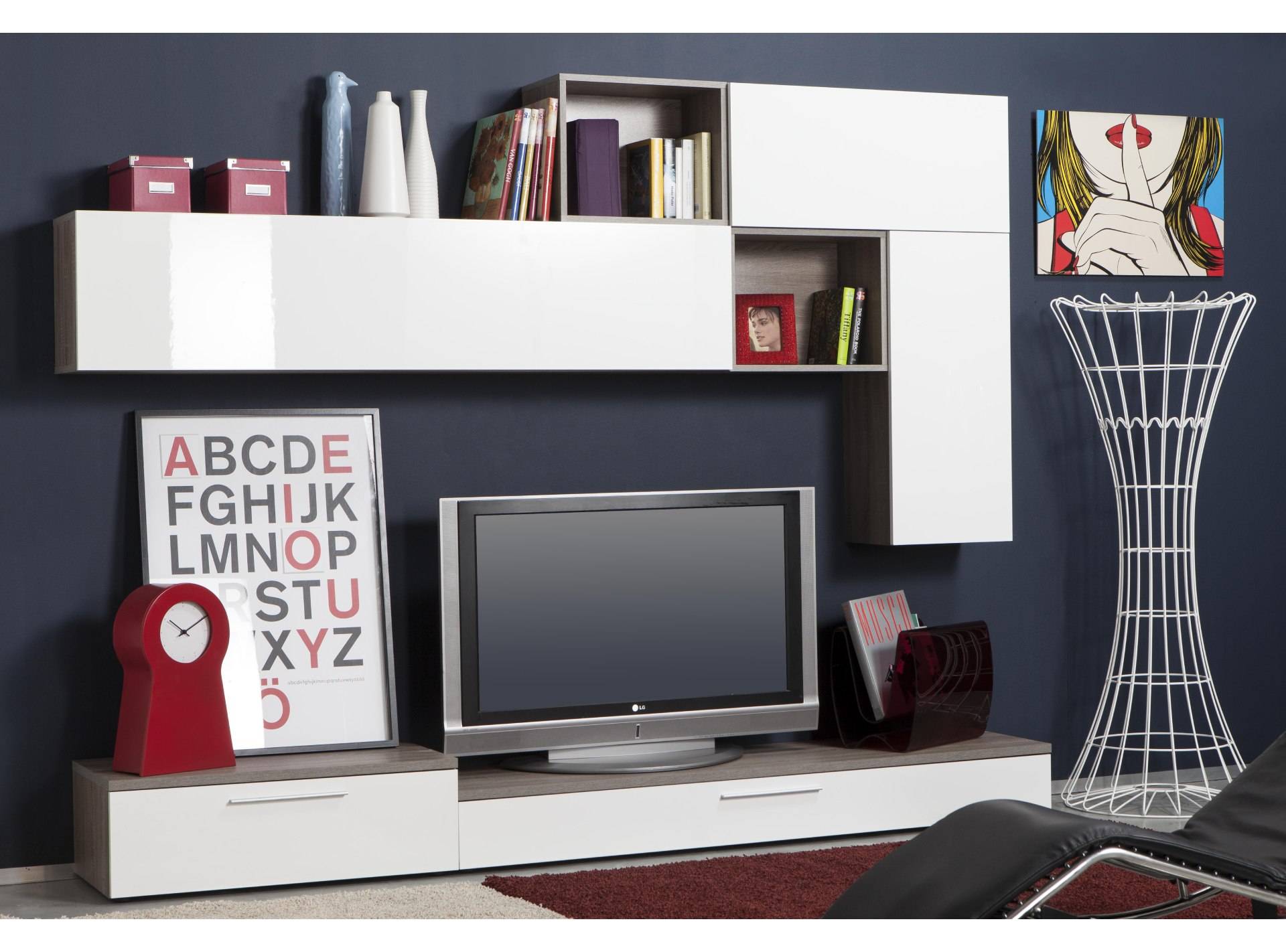 Parete soggiorno componibile con vani a giorno e pensili posizionabili a piacere