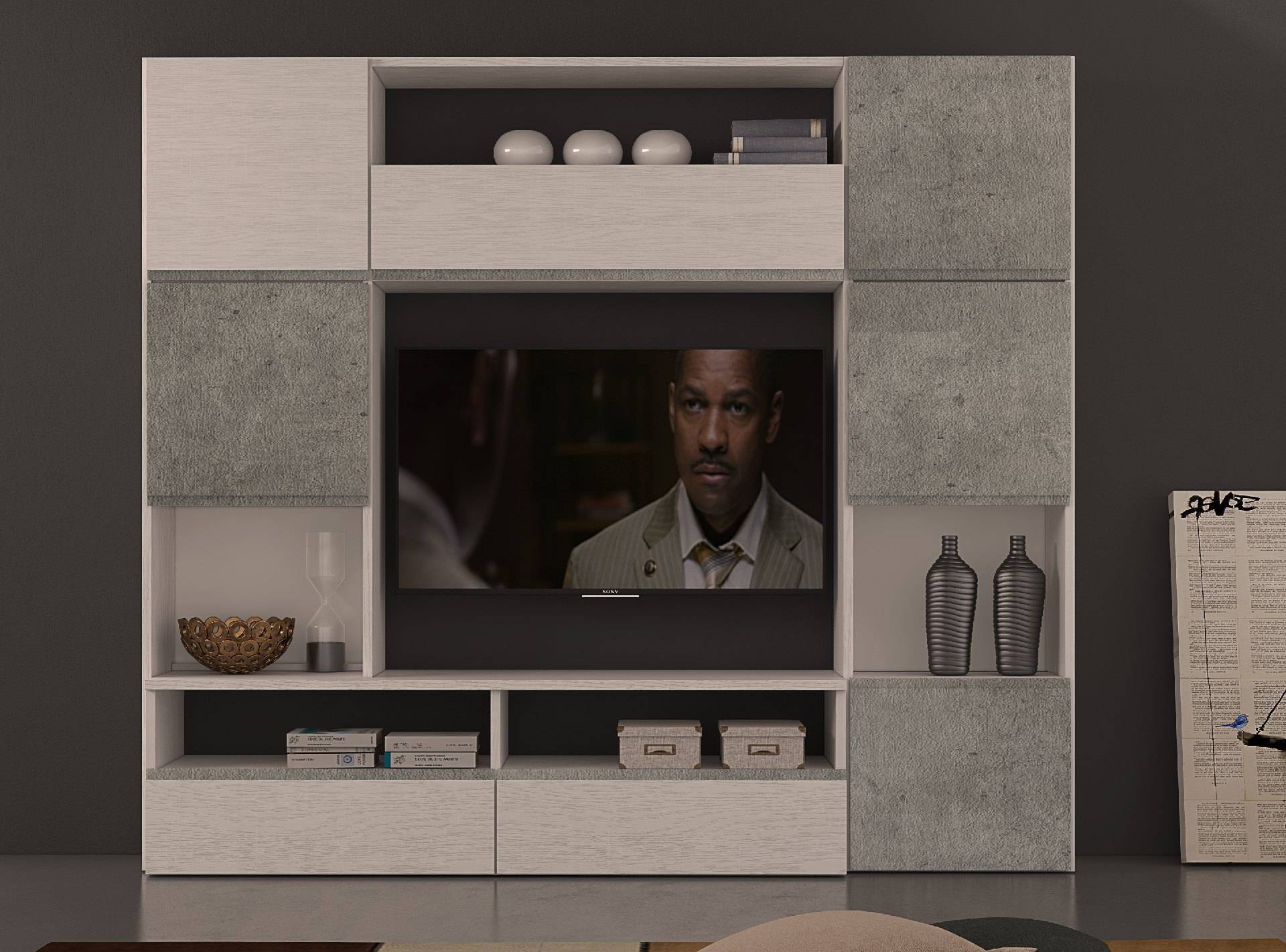 Parete soggiorno componibile con vano porta tv, vani a giorno e cassetti
