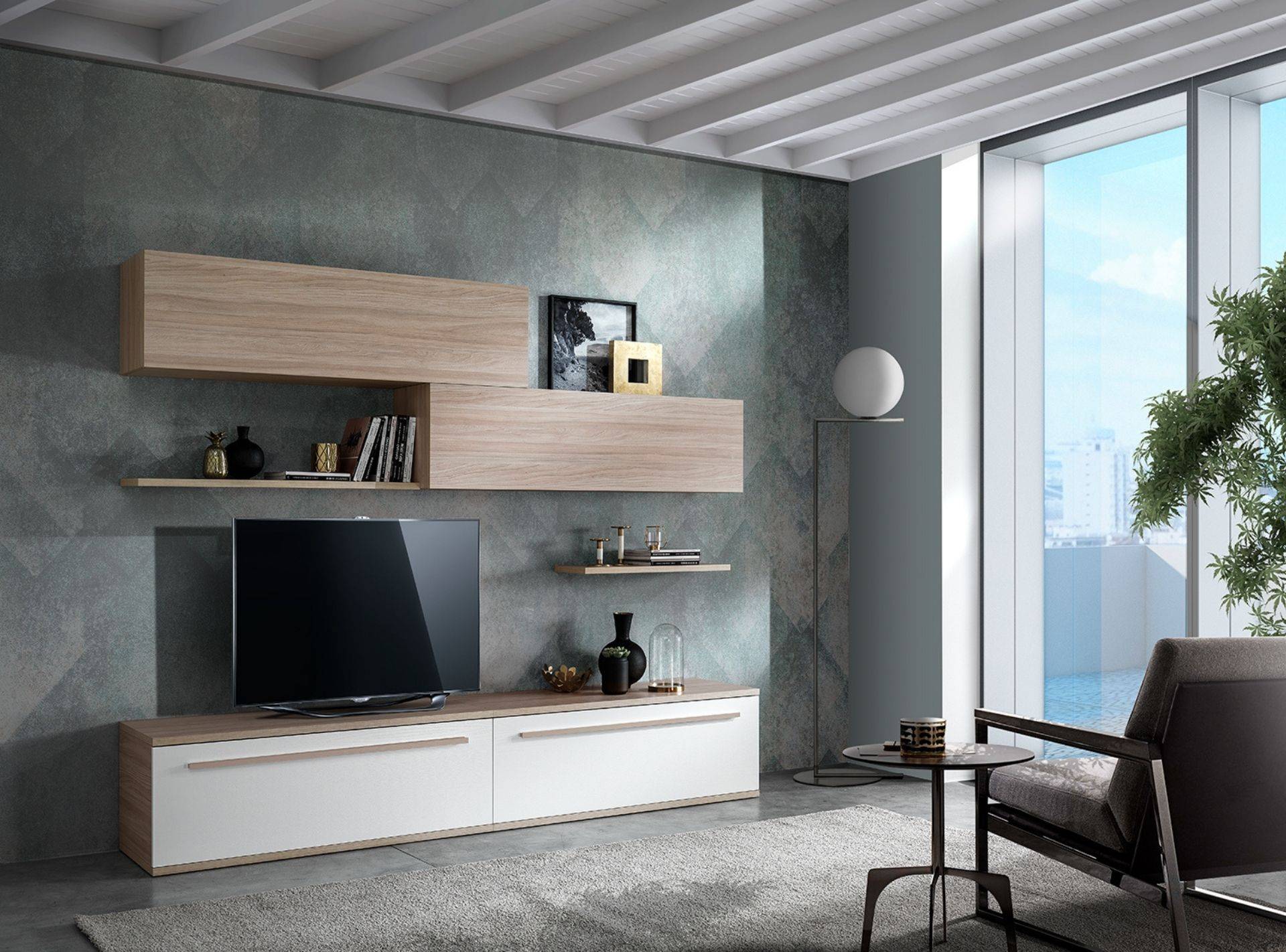 Parete soggiorno moderna composta da basi, pensili e mensole componibile secondo le tue esigenze