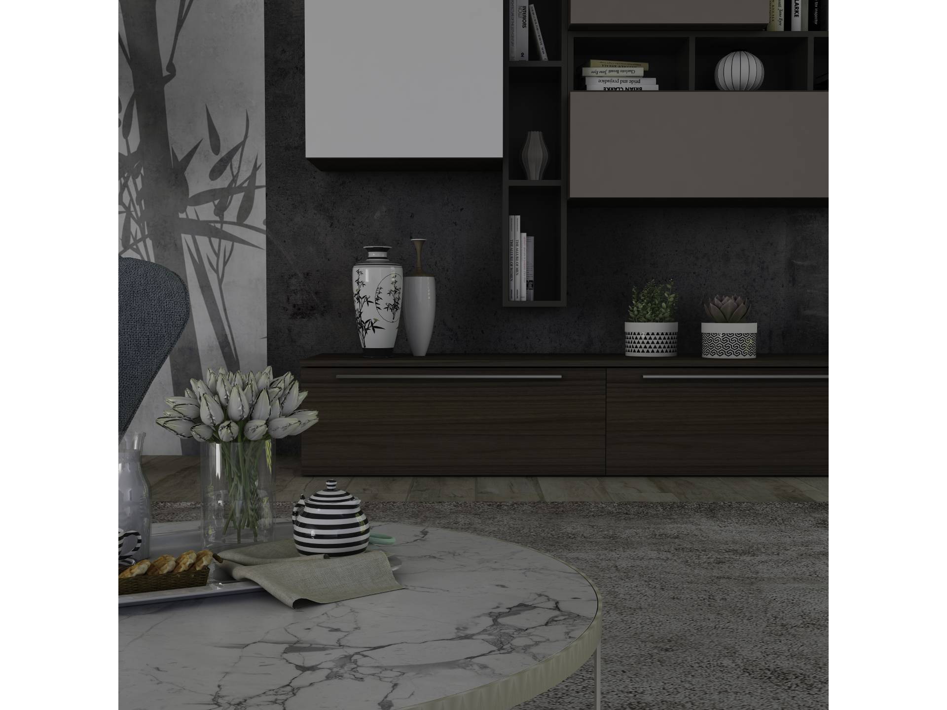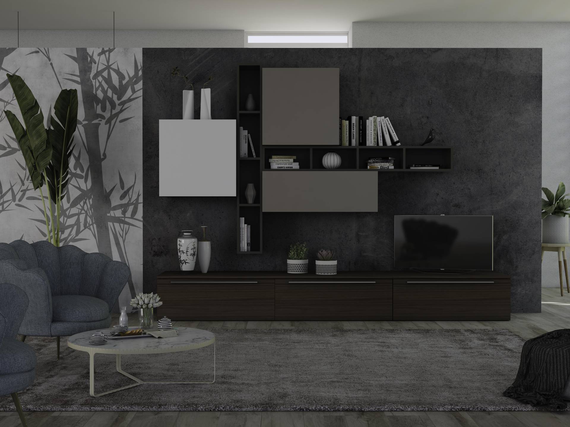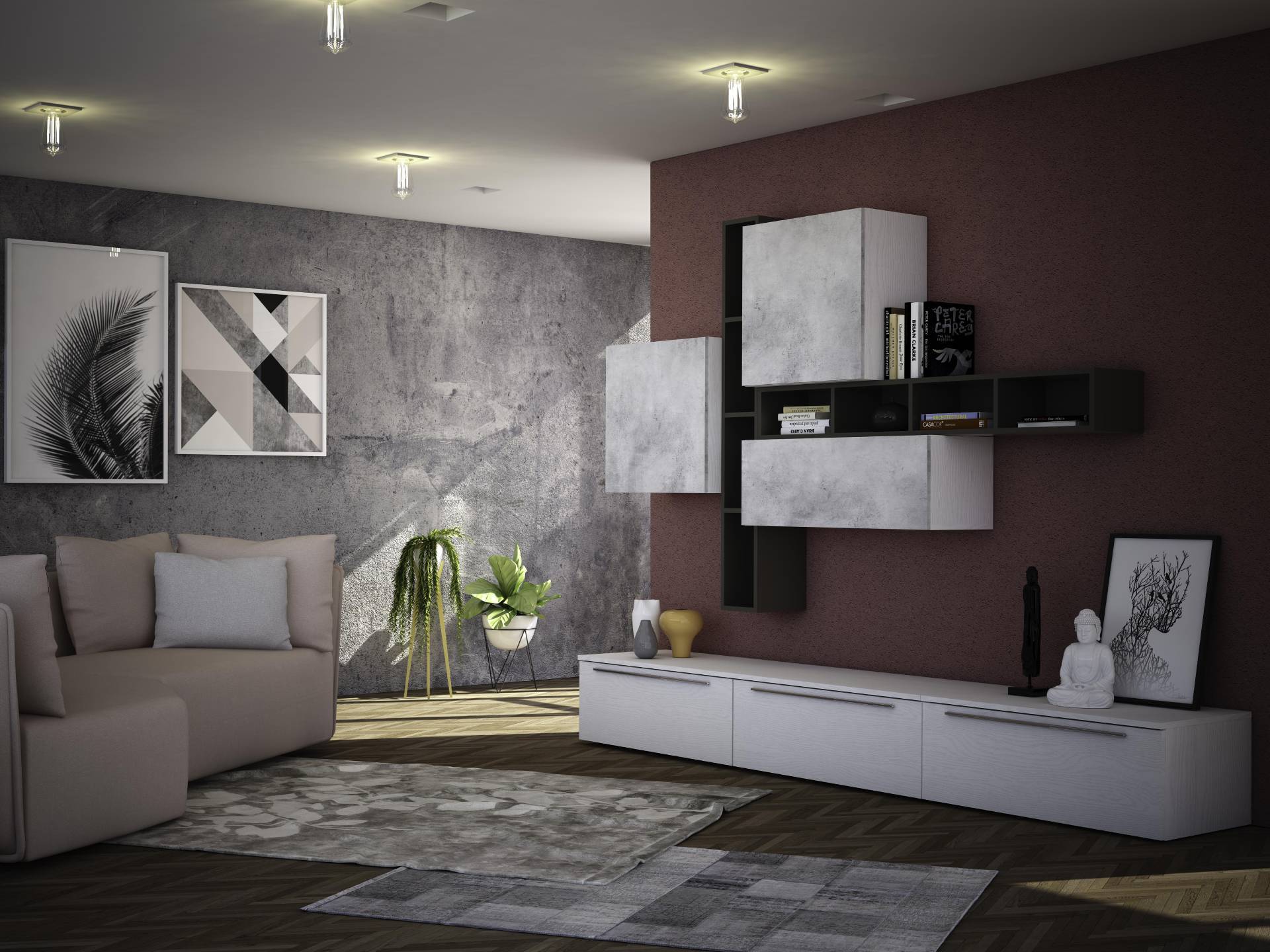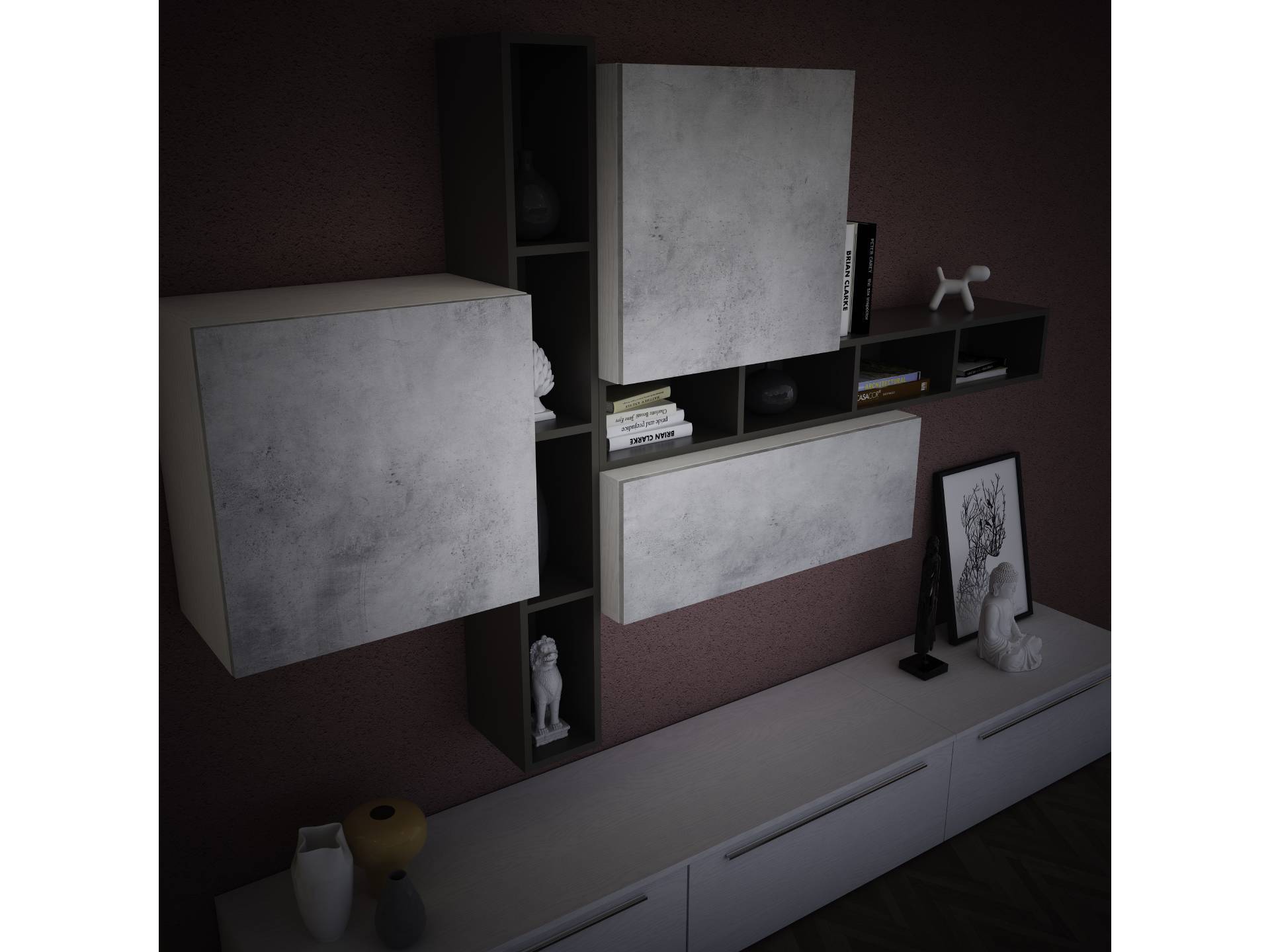 1 - Struttura in finitura bianco frassino, frontali elementi sospesi in finitura cemento.Elemento a giorno sospeso in finitura fango.