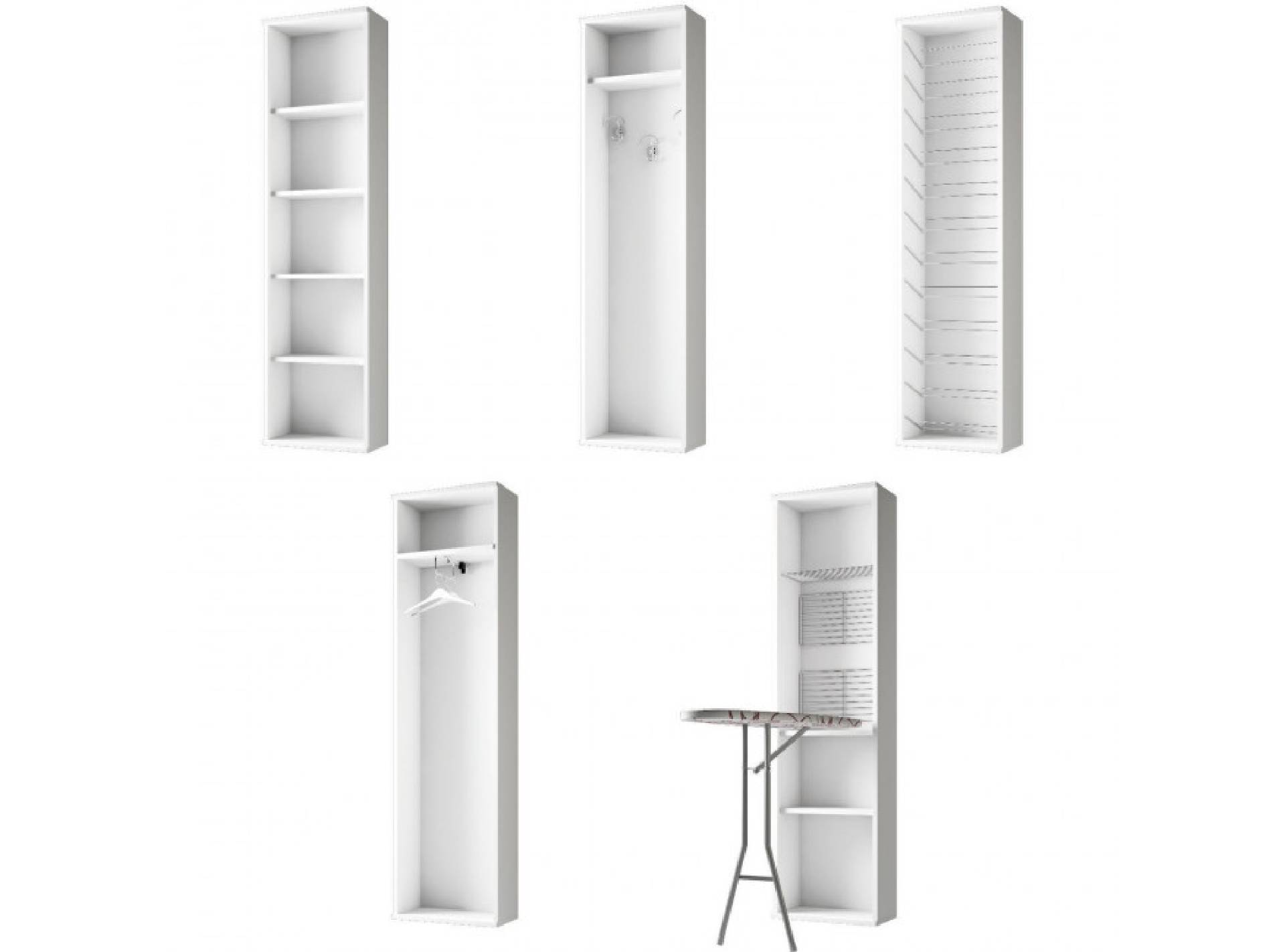 - 2 armadietti con anta battente, uno dotato di set di 3 ganci appendiabiti in metallo cromato compreso di 1 ripiano, l'altro dotato di kit asse da stiro corredato di 1 ripiano e 3 ripiani ribaltabili in metallo cromato