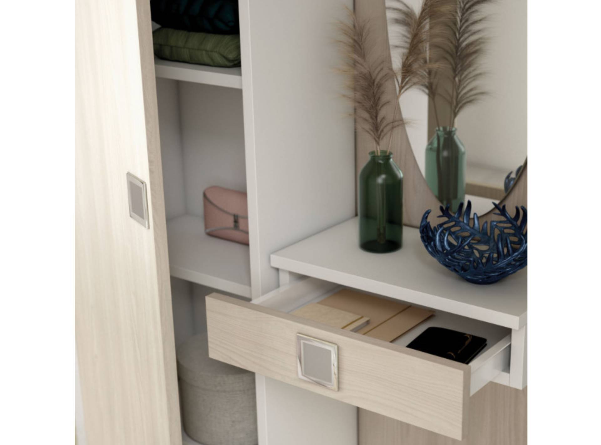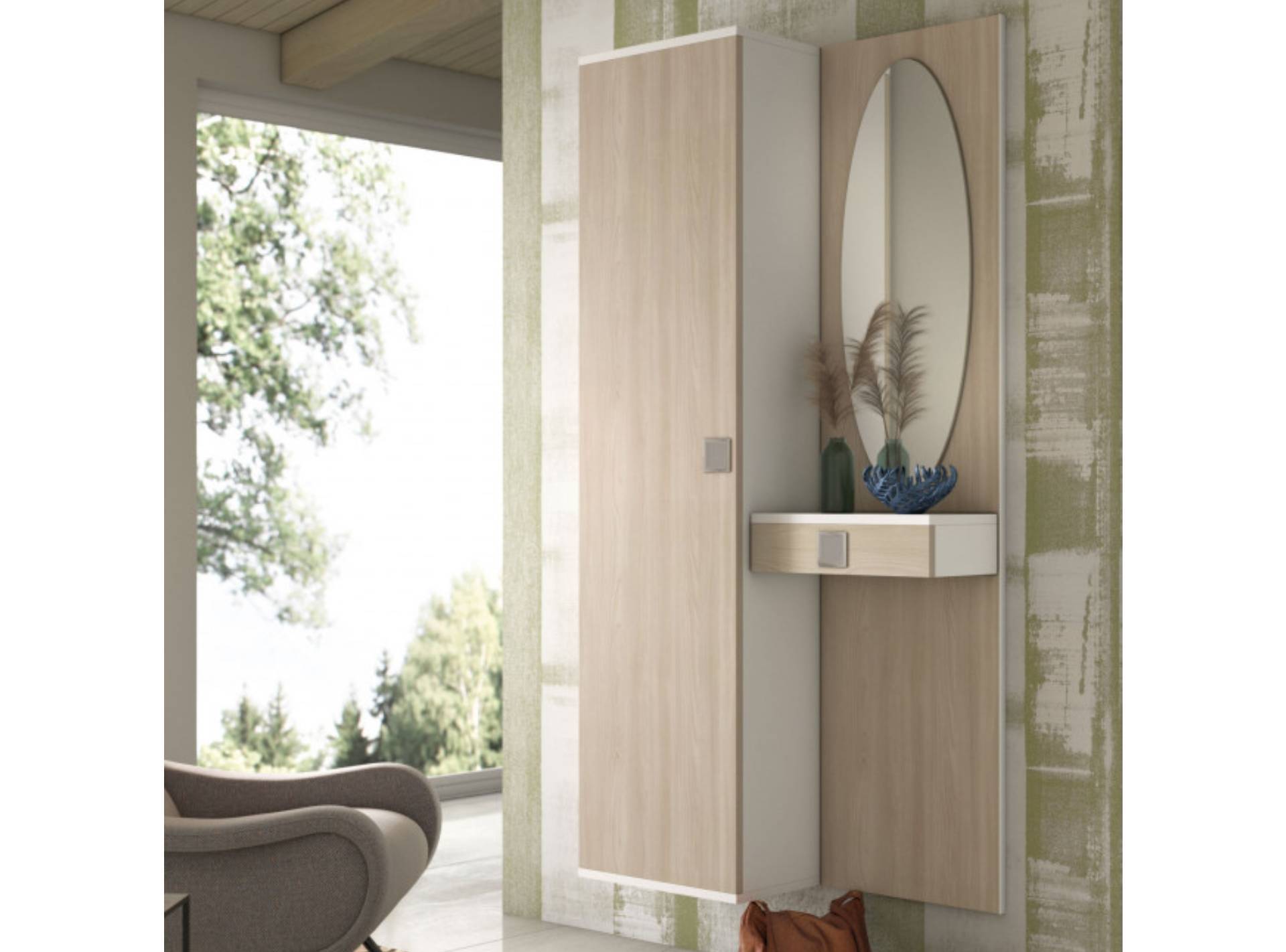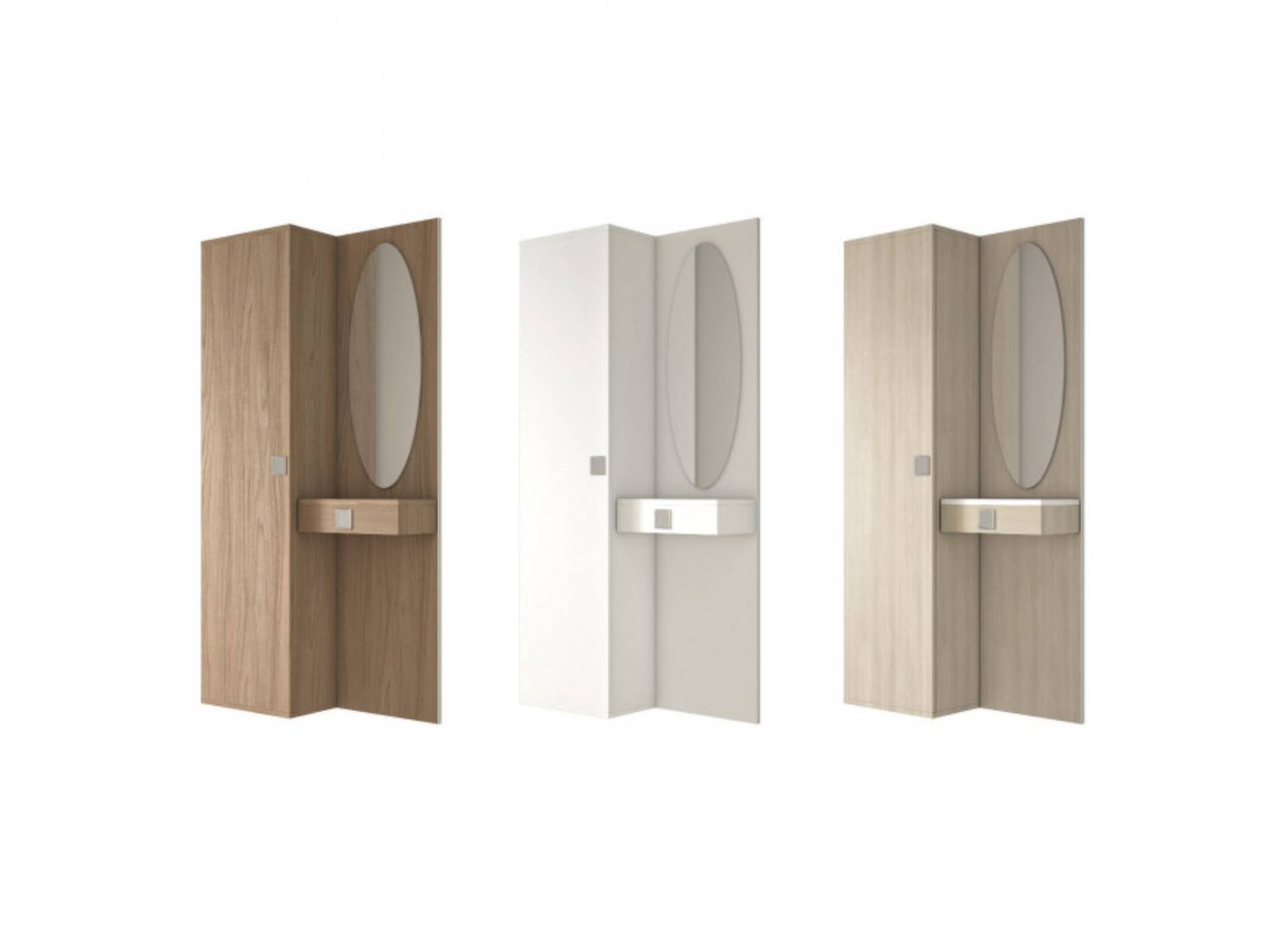 L'armadietto è diviso in due parti da una mensola in tinta con la struttura: nel vano superiore si possono riporre le borse, in quello inferiore appendere giacche, cappotti o sciarpe. Uno specchio ovale o rettangolare completa la composizione, insieme ad un cassetto sospeso utile come pratico svuotatasche per piccoli oggetti.