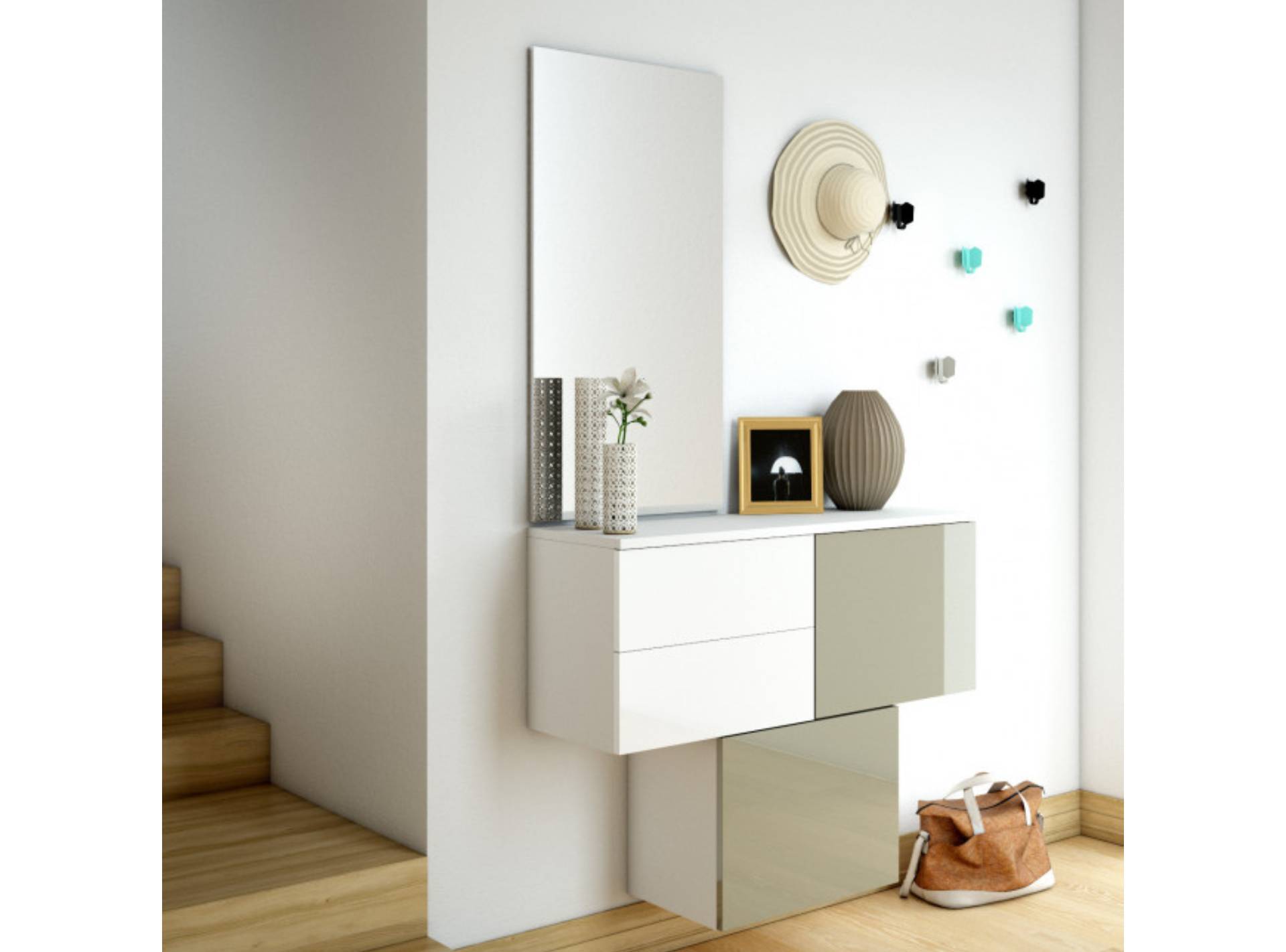 H05 è un mobile ingresso componibile con cubi scarpiera, cassettiera svuotatasche, specchio e ganci appendiabiti. Composto da tre elementi pensili con ante e cassetti, il mobile sospeso a parete misura 100 cm ma può essere realizzato in infinite combinazioni.