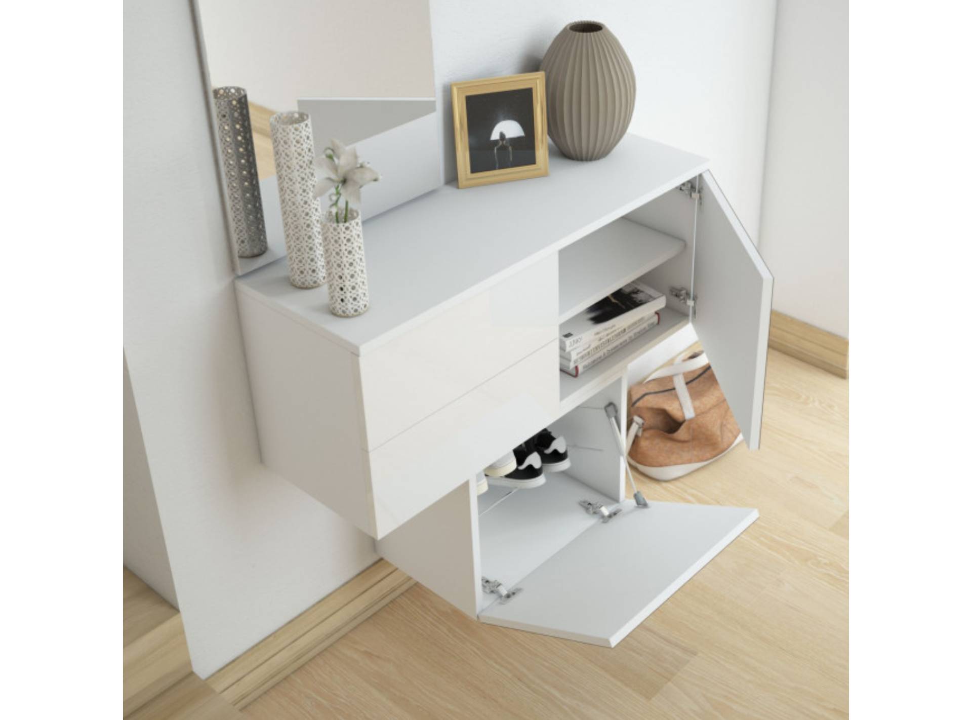 - 3 contenitori a parete: 1 con cassetti / 2 con ante a battente (2 griglie portascarpe interne / 1 ripiano)