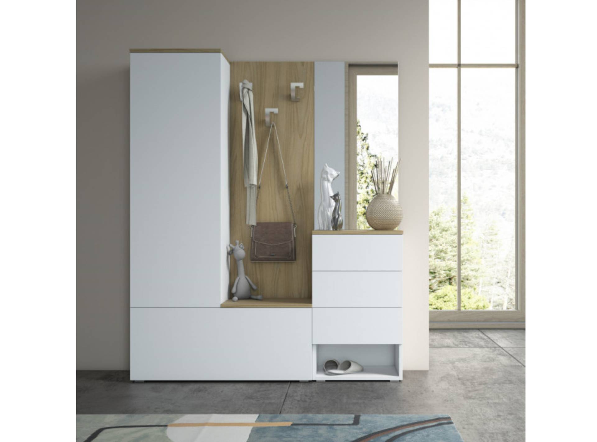 Molto più di una parete appendiabiti, H12 include un piccolo posto a sedere e contenitori multiuso in cui riporre tutto ciò che serve.Ulteriori attaccapanni si trovano all'esterno del guardaroba, con 3 ganci per le giacche e le borsette di uso quotidiano. Scarpe e ciabatte possono essere riposte in ordine all'interno della scarpiera a terra, perfettamente attrezzata a rastrelliera. Infine la cassettiera offre un comodo porta-tutto utilizzabile come svuotatasche.