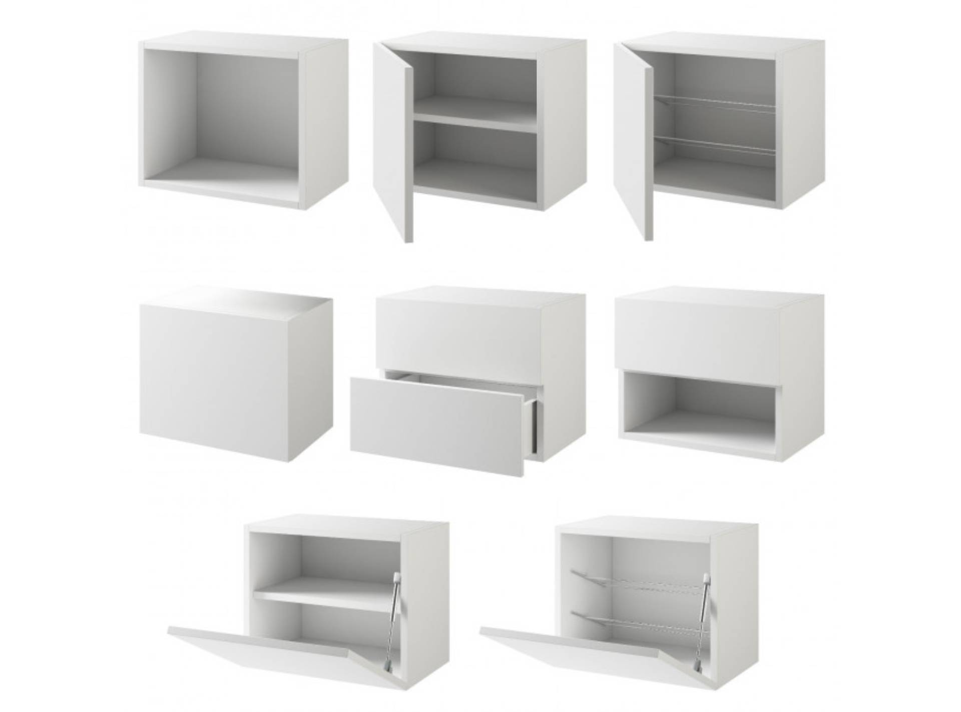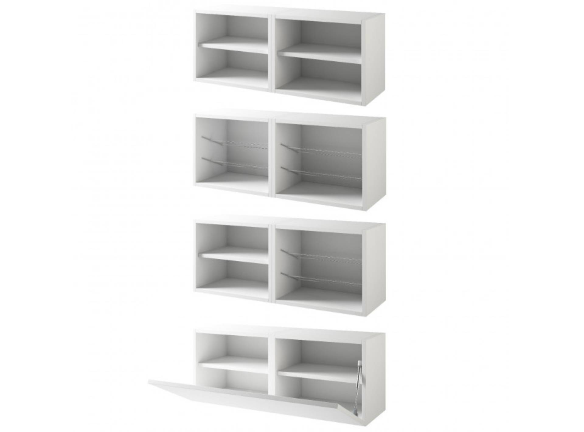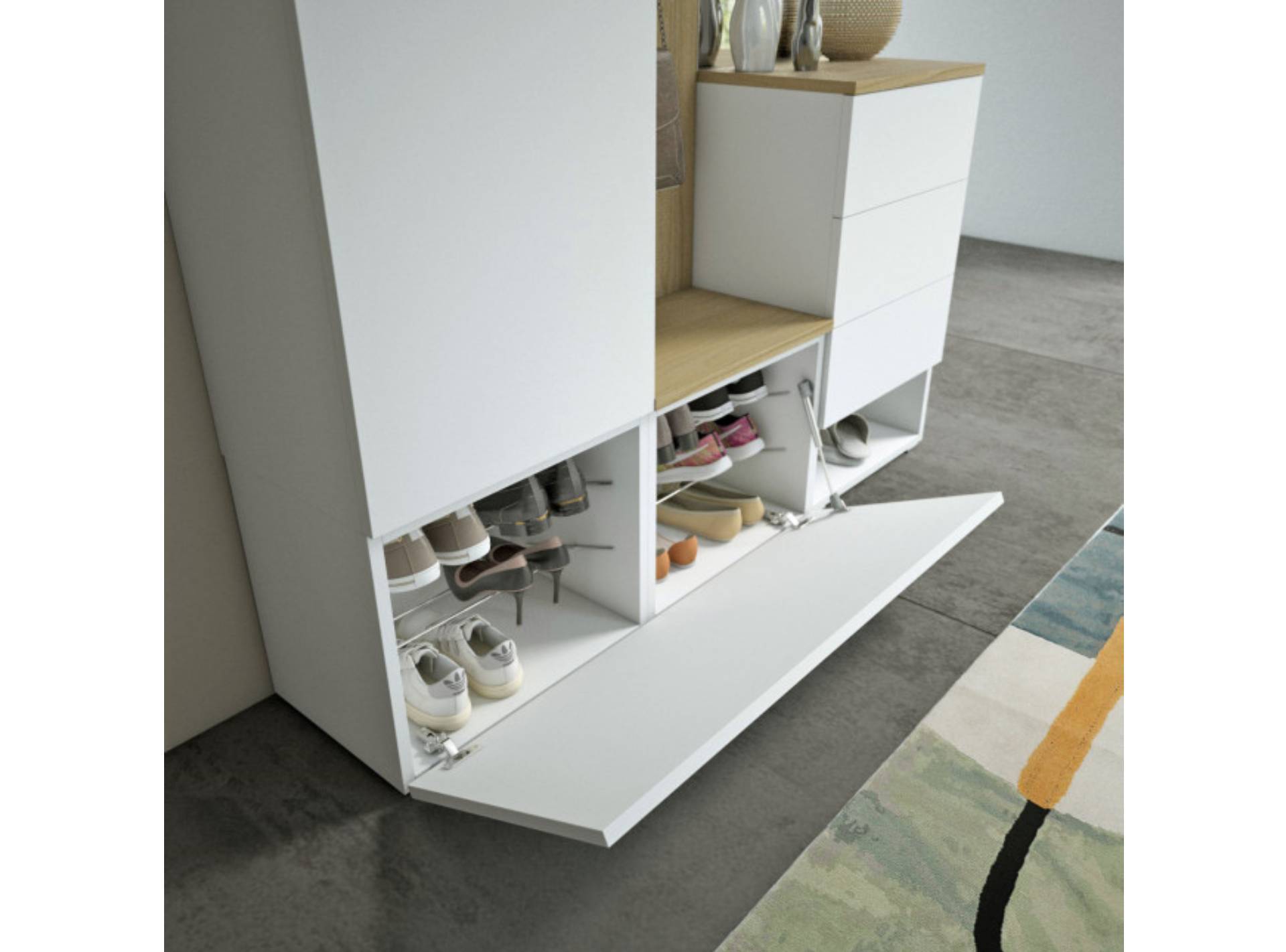 - 3 contenitori modulari: 1 con 2 cassetti / 1 con cassetto e vano a giorno / 1 con anta a ribalta (griglie portascarpe interne)