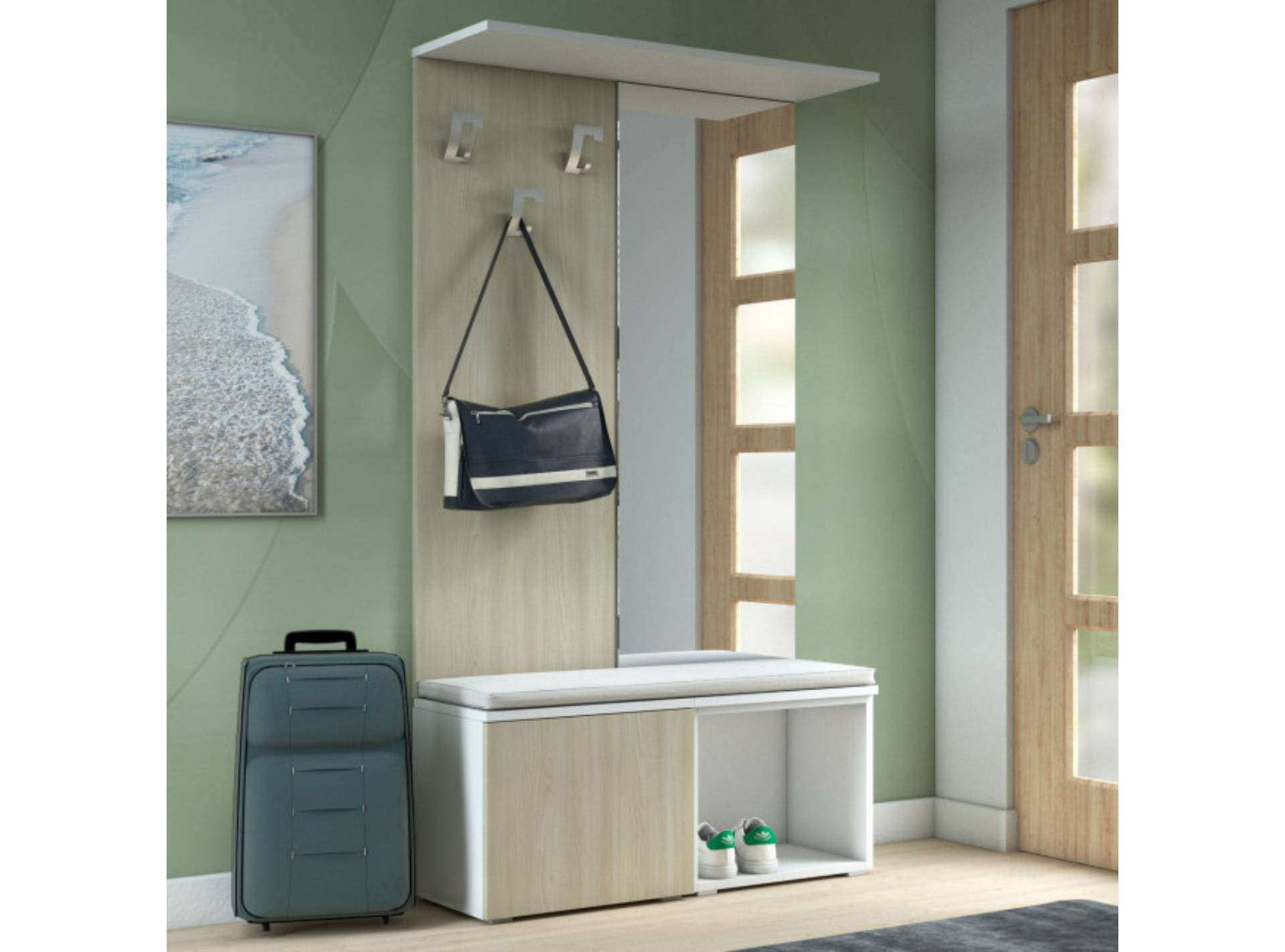H13 è un mobile ingresso appendiabiti con panca con piccola scarpiera integrata e specchio. Moderno e funzionale, è la soluzione ideale per arredare uno spazio multiuso, comodo e ben organizzato. Realizzato con i moduli componibili della collezione Home, l'ingresso include in soli 100 cm due posti a sedere, porta scarpe, attaccapanni e specchiera.Oltre a pannelli con ganci portabito, specchi e contenitori, sono infatti disponibili guardaroba a giorno o chiusi, armadietti, mensole con porta grucce estraibili e accessori.Completa la composizione una mensola utilizzabile come cappelliera o ripiano e uno specchio.