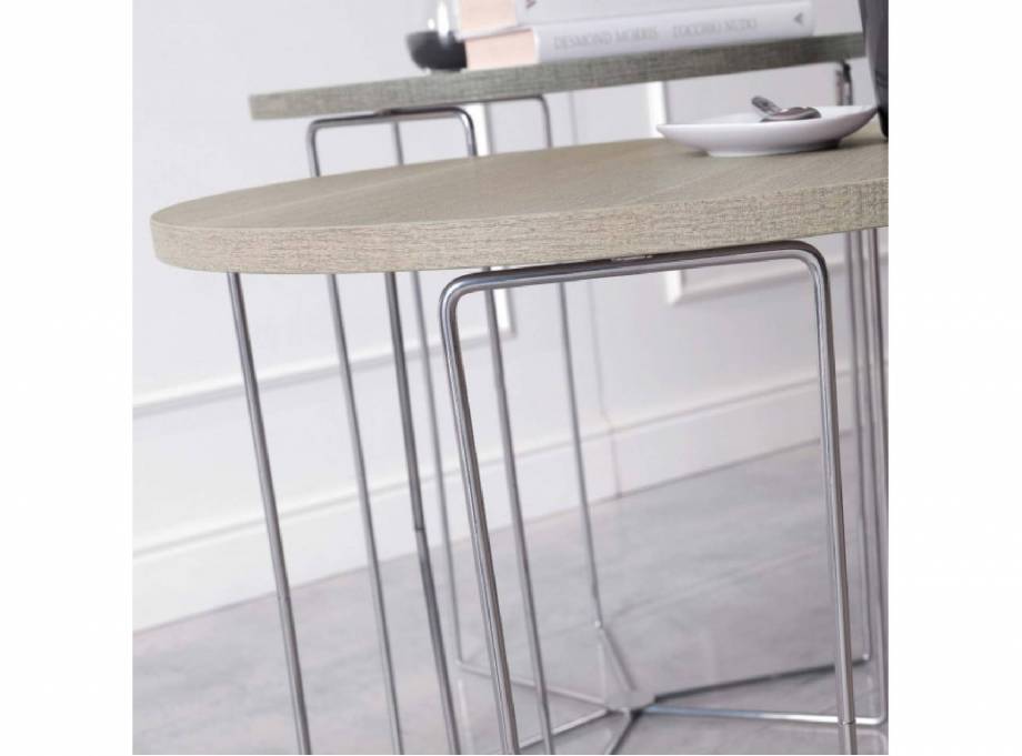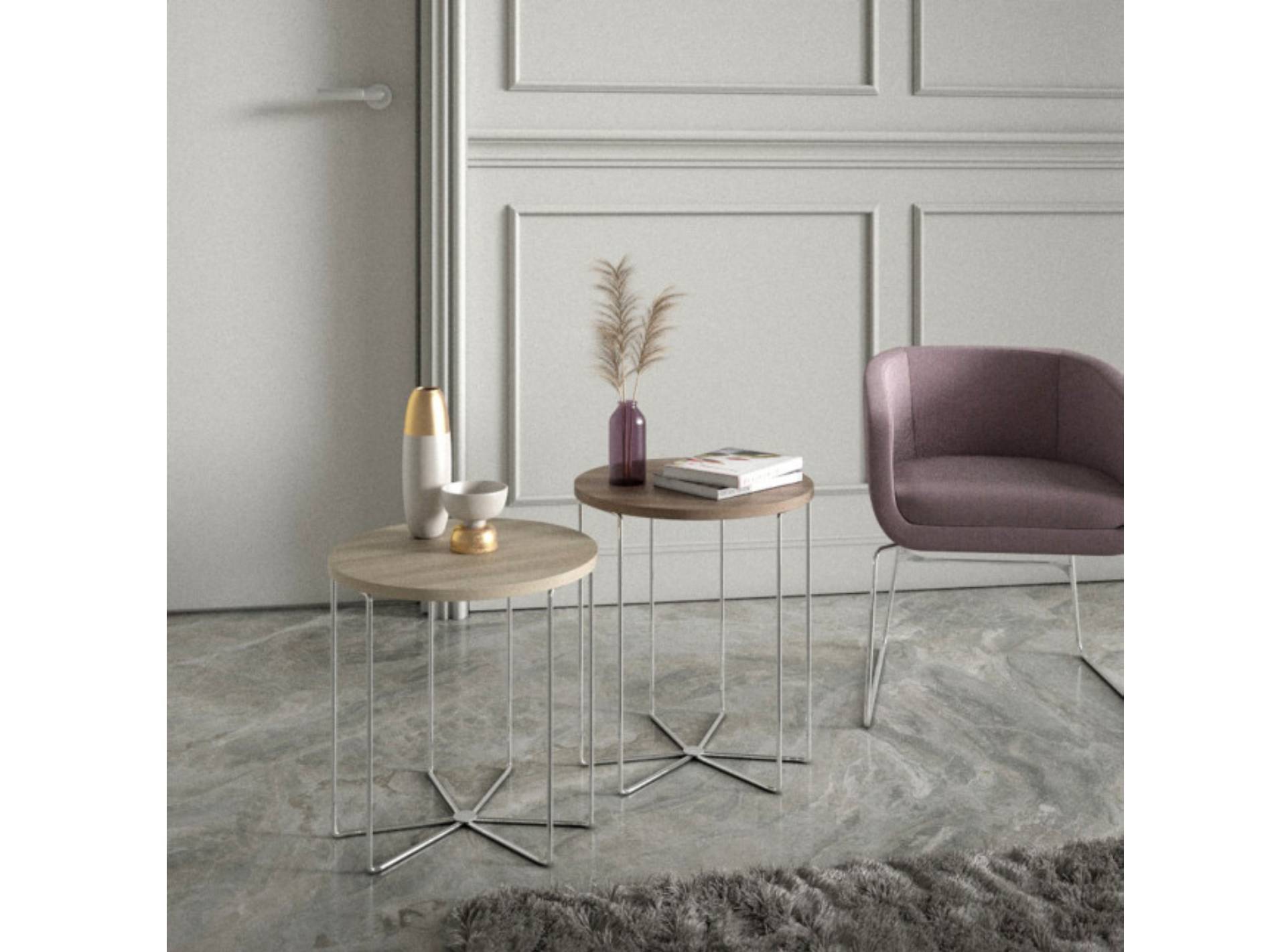 Silver è un tavolino rotondo per la zona lato divano del salotto. Il piano poggia su una struttura a tubolari di metallo cromato disposti a raggiera. È disponibile in bianco, tortora, effetto legno di noce e olmo, o finitura cemento.