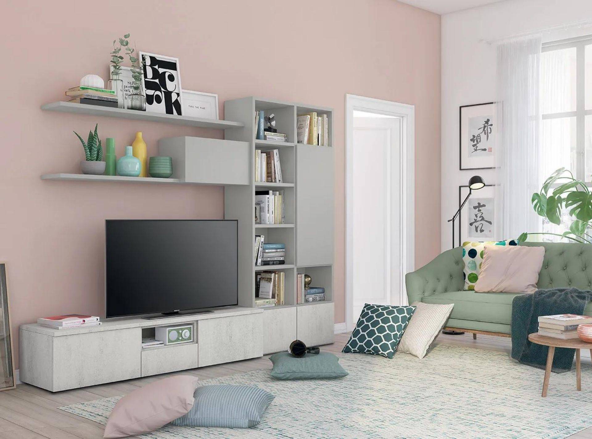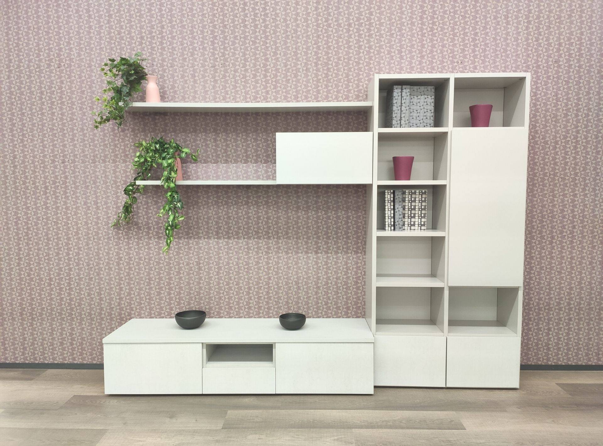 Parete soggiorno con base a terra con vano a giorno e Libreria Infinity a terra colore grid grigio dorian