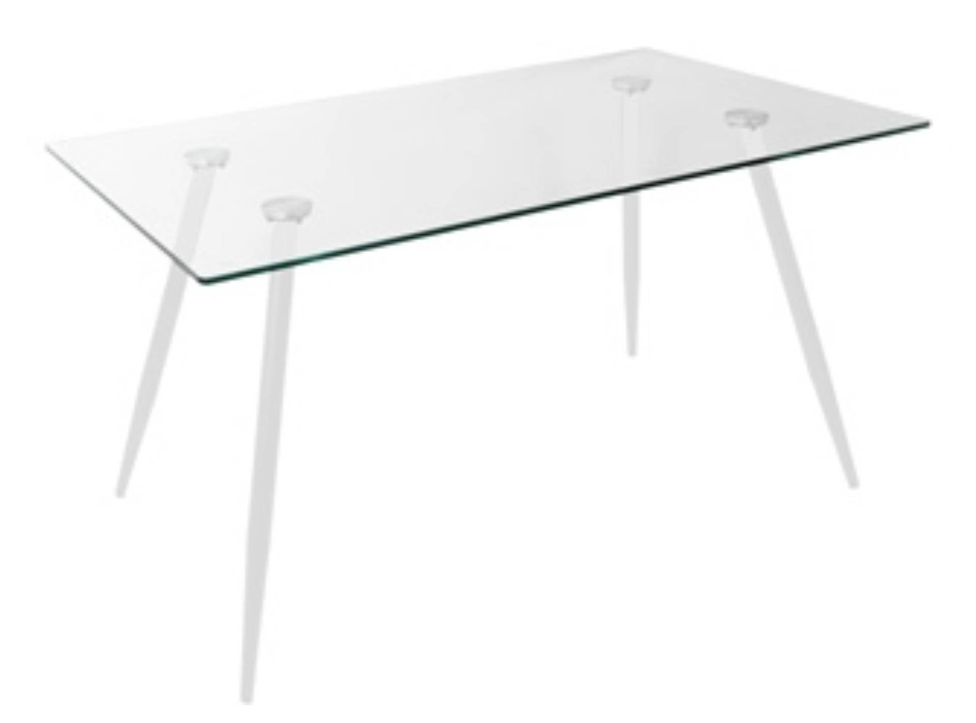Tavolo fisso Maura con piano in vetro temperato e gambe in metallo.