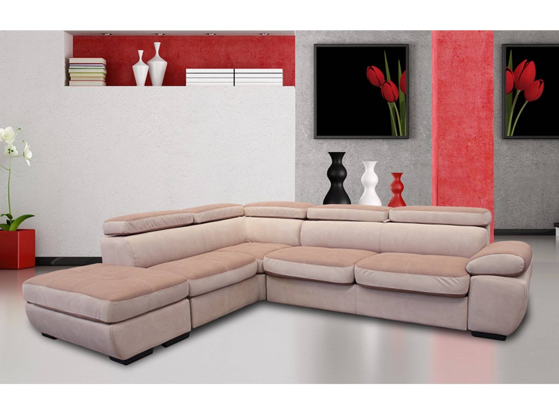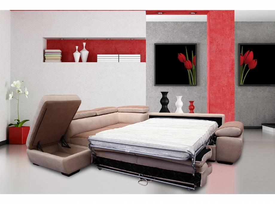 Divano angolare con letto a ribalta, poggiatesta reclinabili e pouf contenitore destro o sinistro