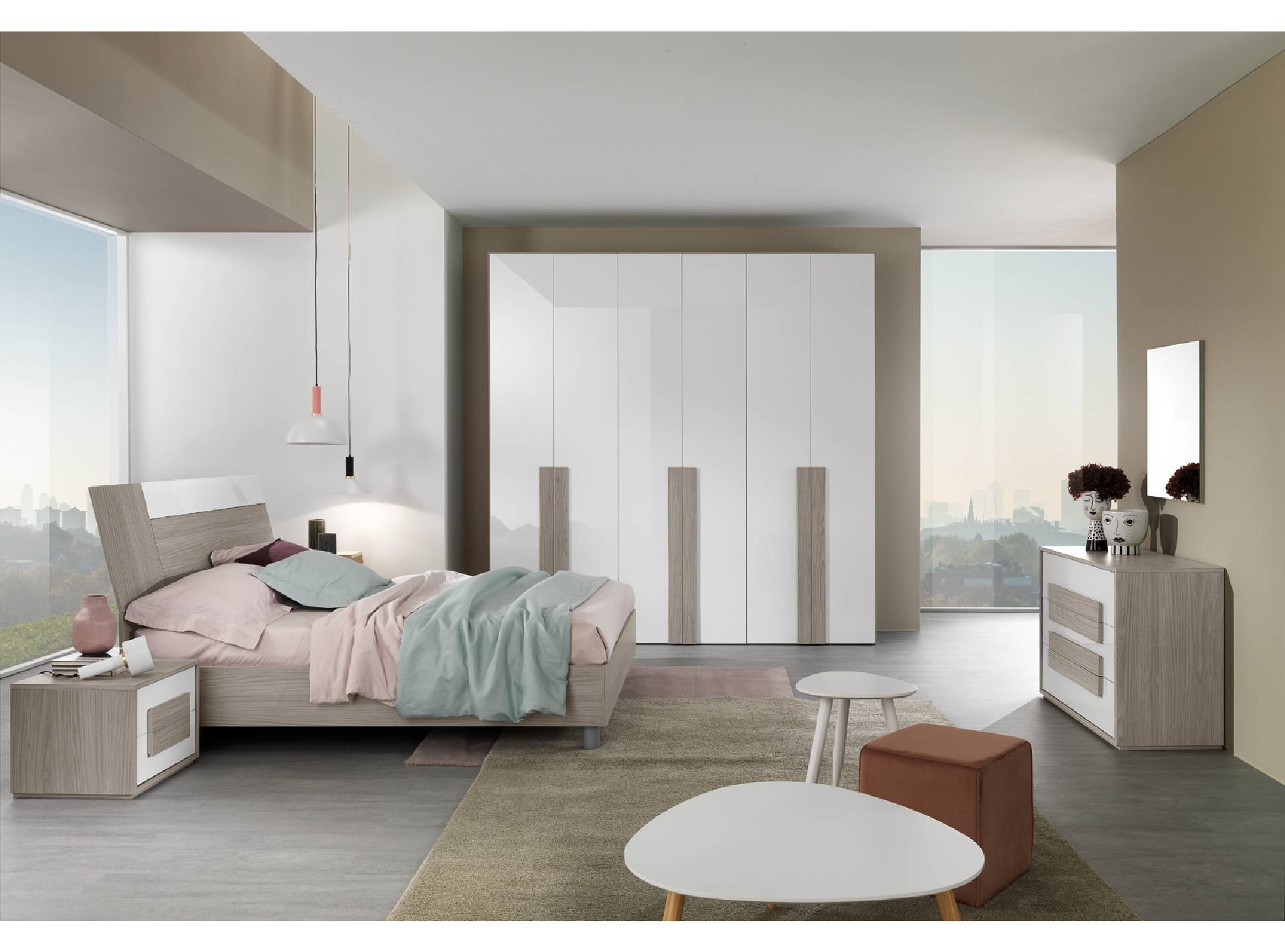 Camera completa di armadio con ante battenti, letto matrimoniale, comò, comodini e specchiera
