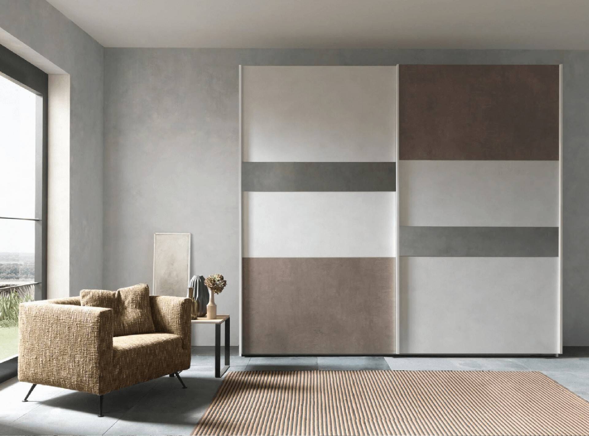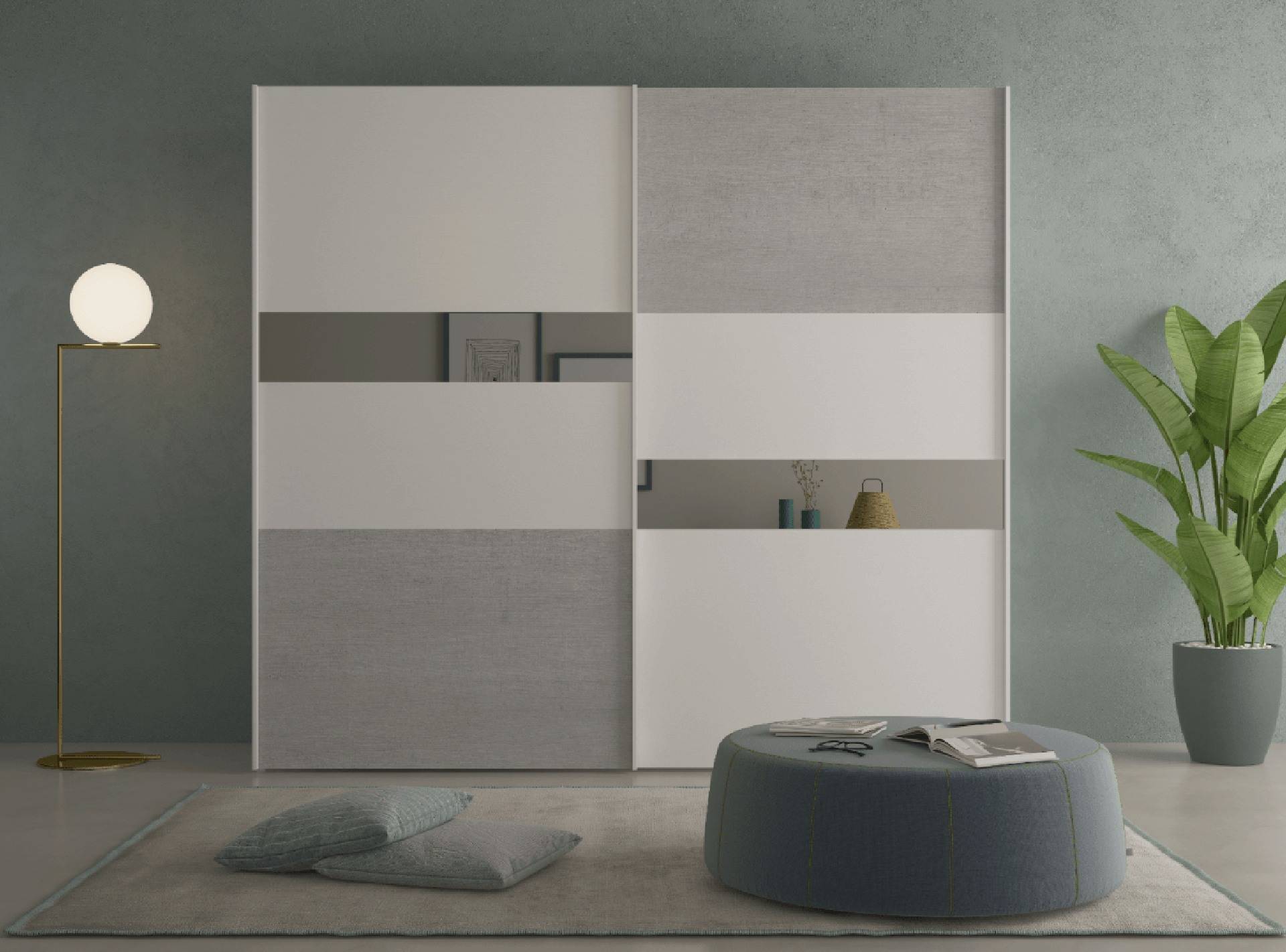 Abbinamenti di tendenza, praticità e design vengono elegantemente racchiusi nell’armadio scorrevole 2 antoni. Armadio che non passa inosservato e diventa l’elemento fulcro della zona notte. Maniglie che corrono per tutta l’altezza dell’armadio della stessa finitura della struttura, pannelli bicolore posizionati per creare moderni effetti cromatici intervallati da inserti in specchio fumè.