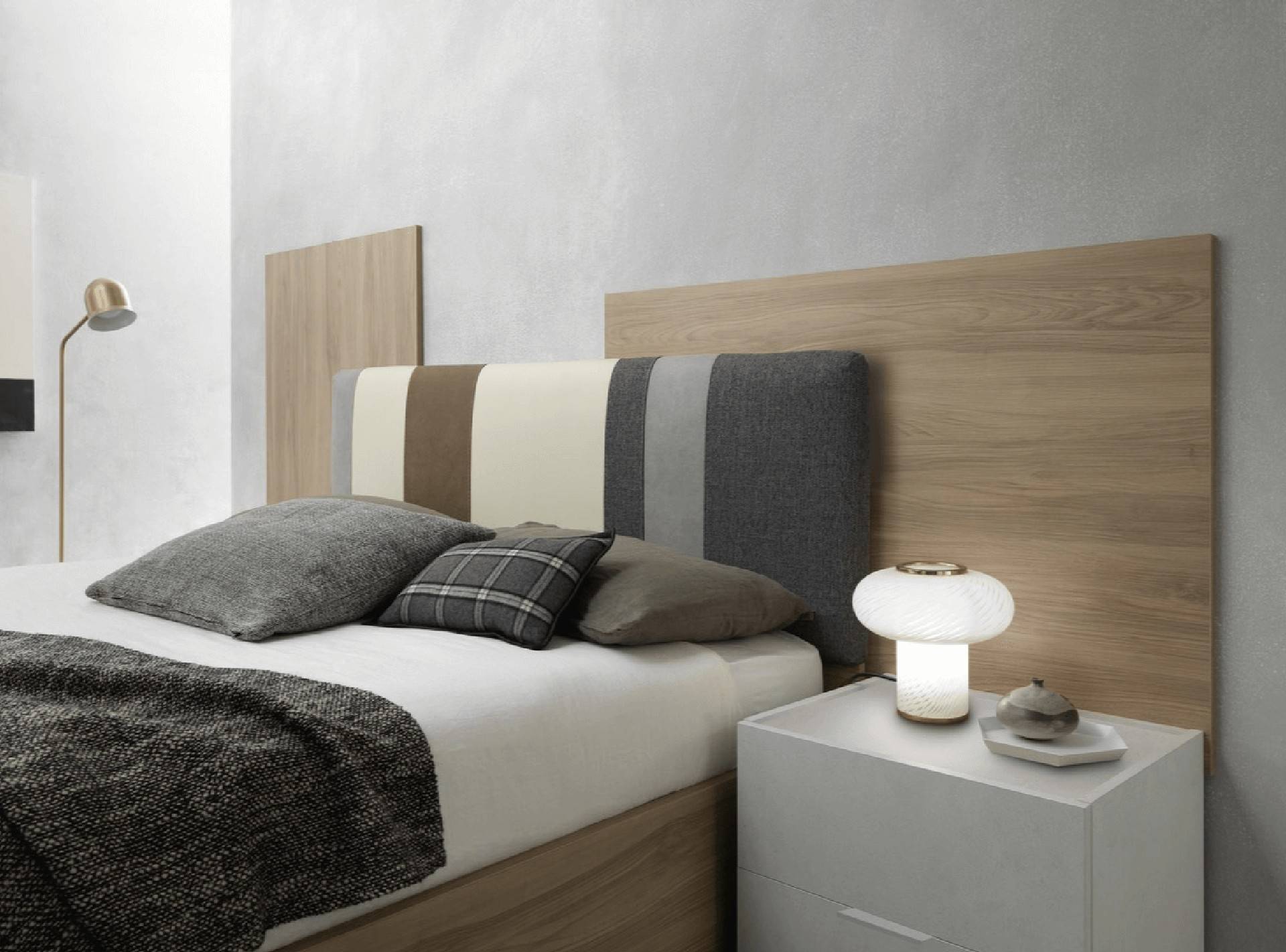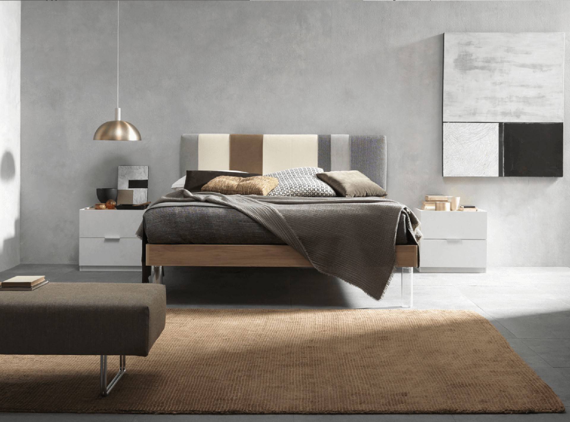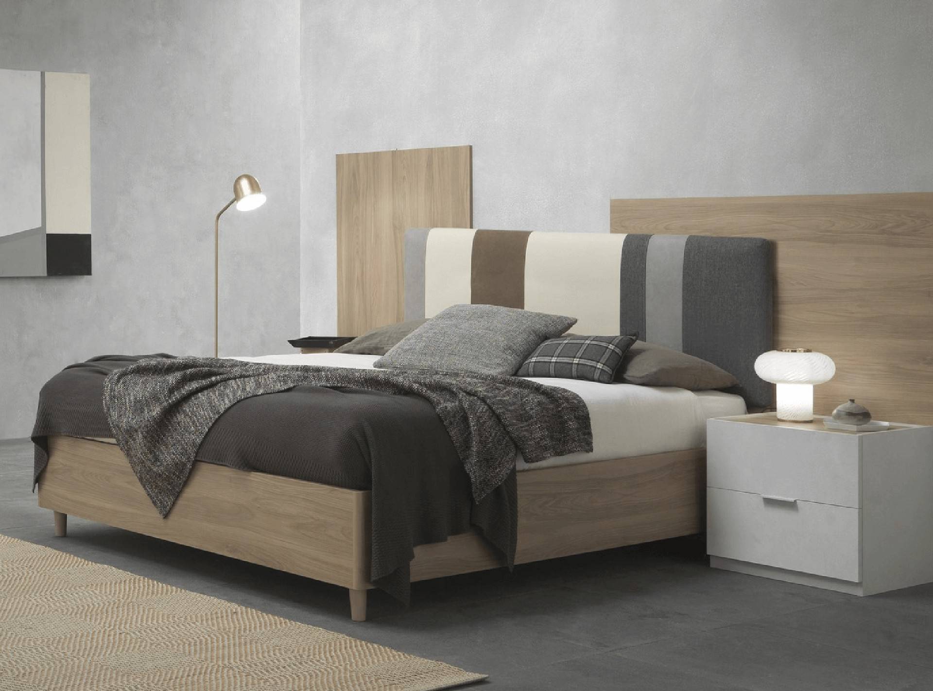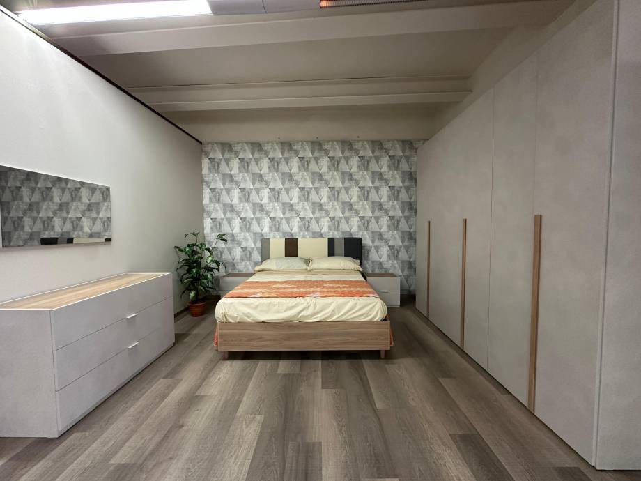 Letto matrimoniale con testiera letto in tessuto, armadio 6 ante battenti, como' e comodini.