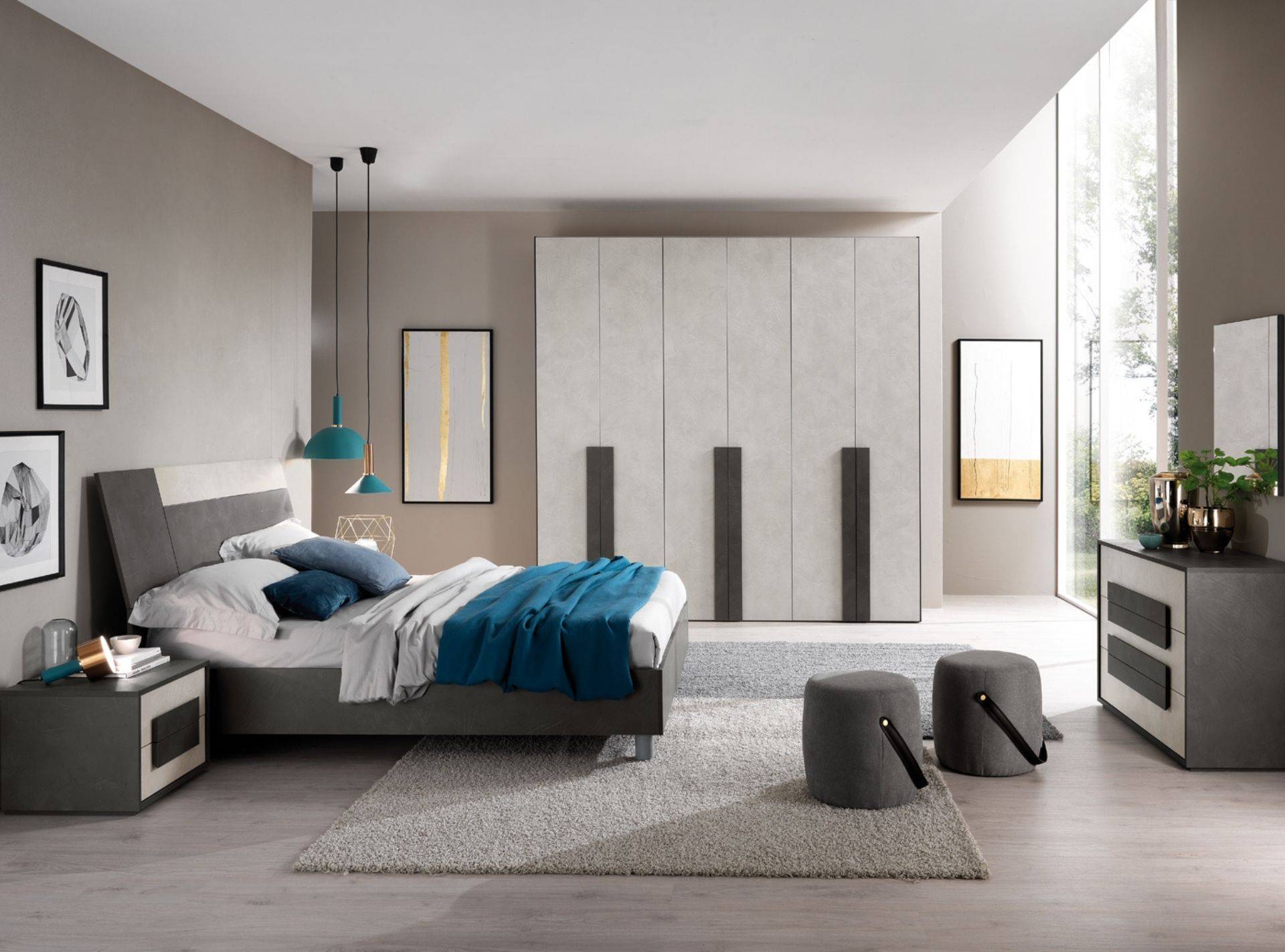 Camera completa di armadio con ante battenti, letto matrimoniale, comò, comodini e specchiera