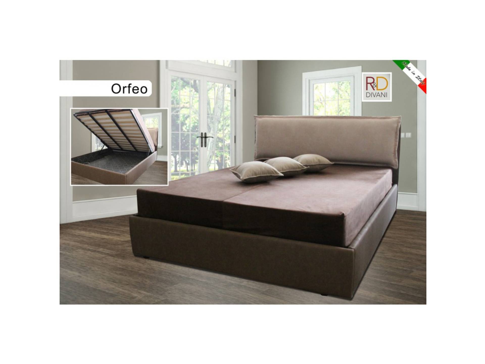 Letto matrimoniale con contenitore disponibile in diverse colorazioni e tessuti.